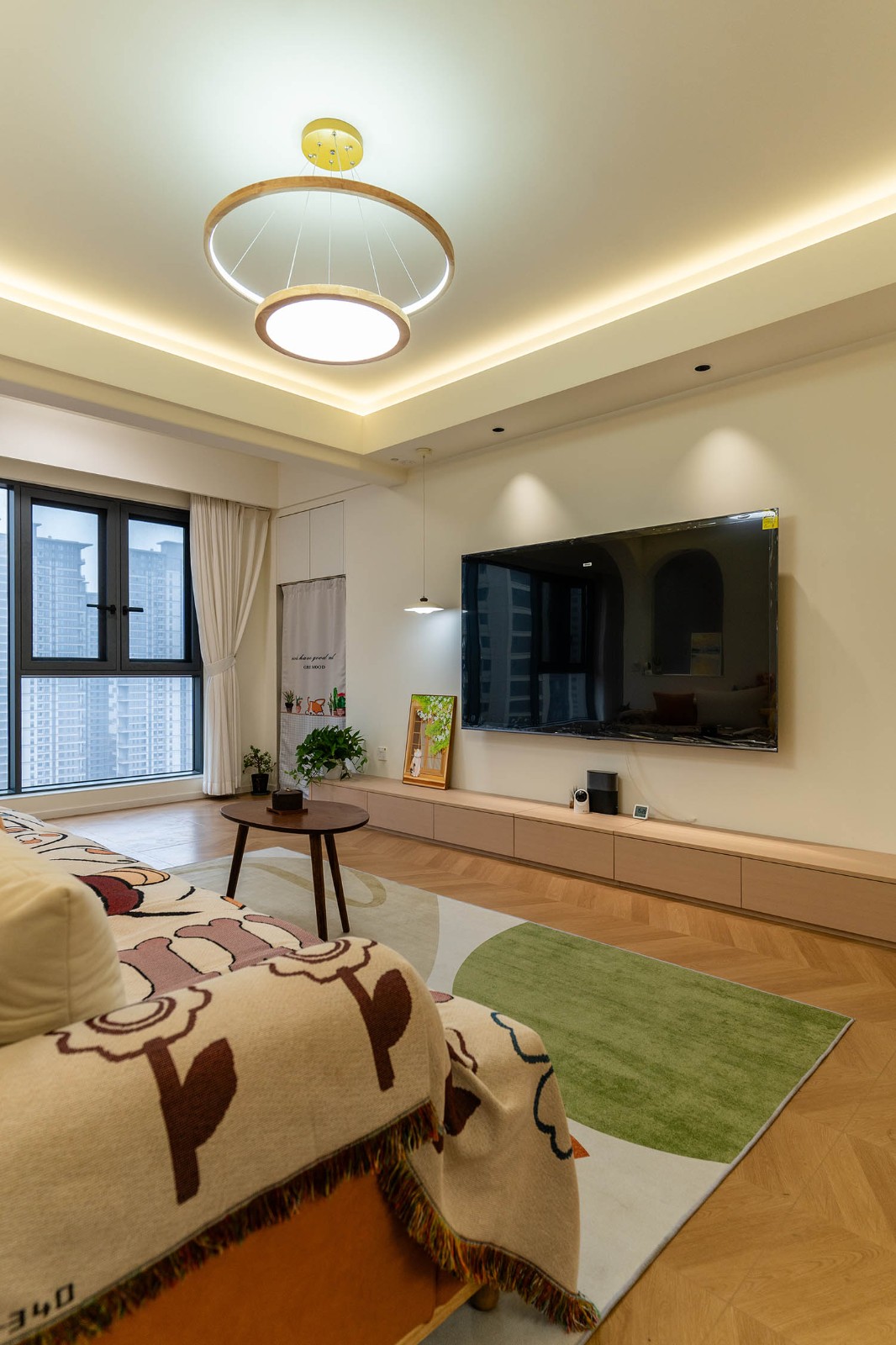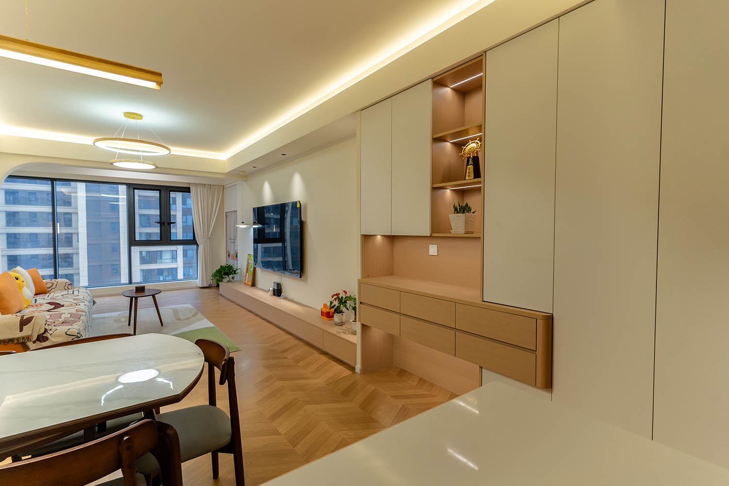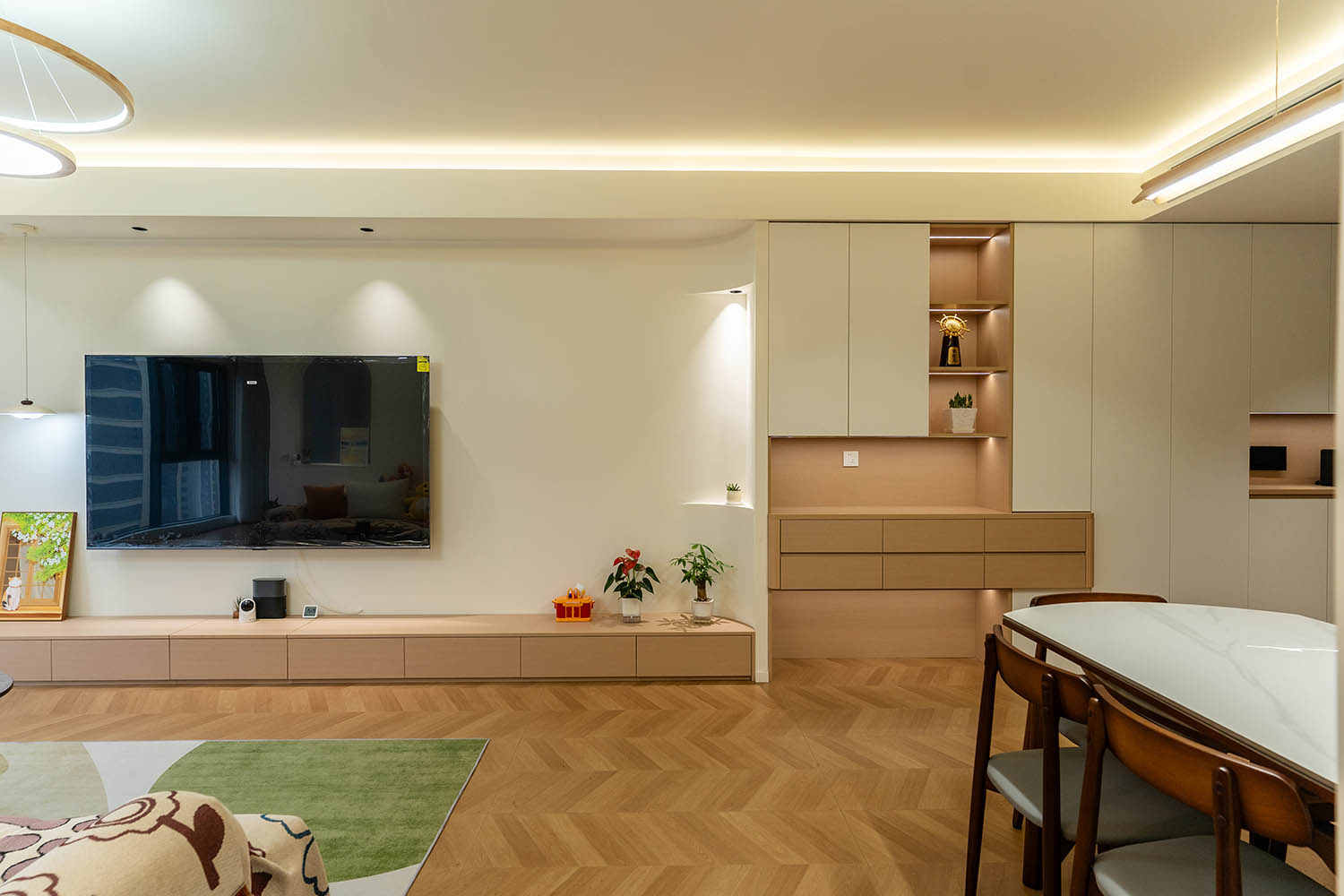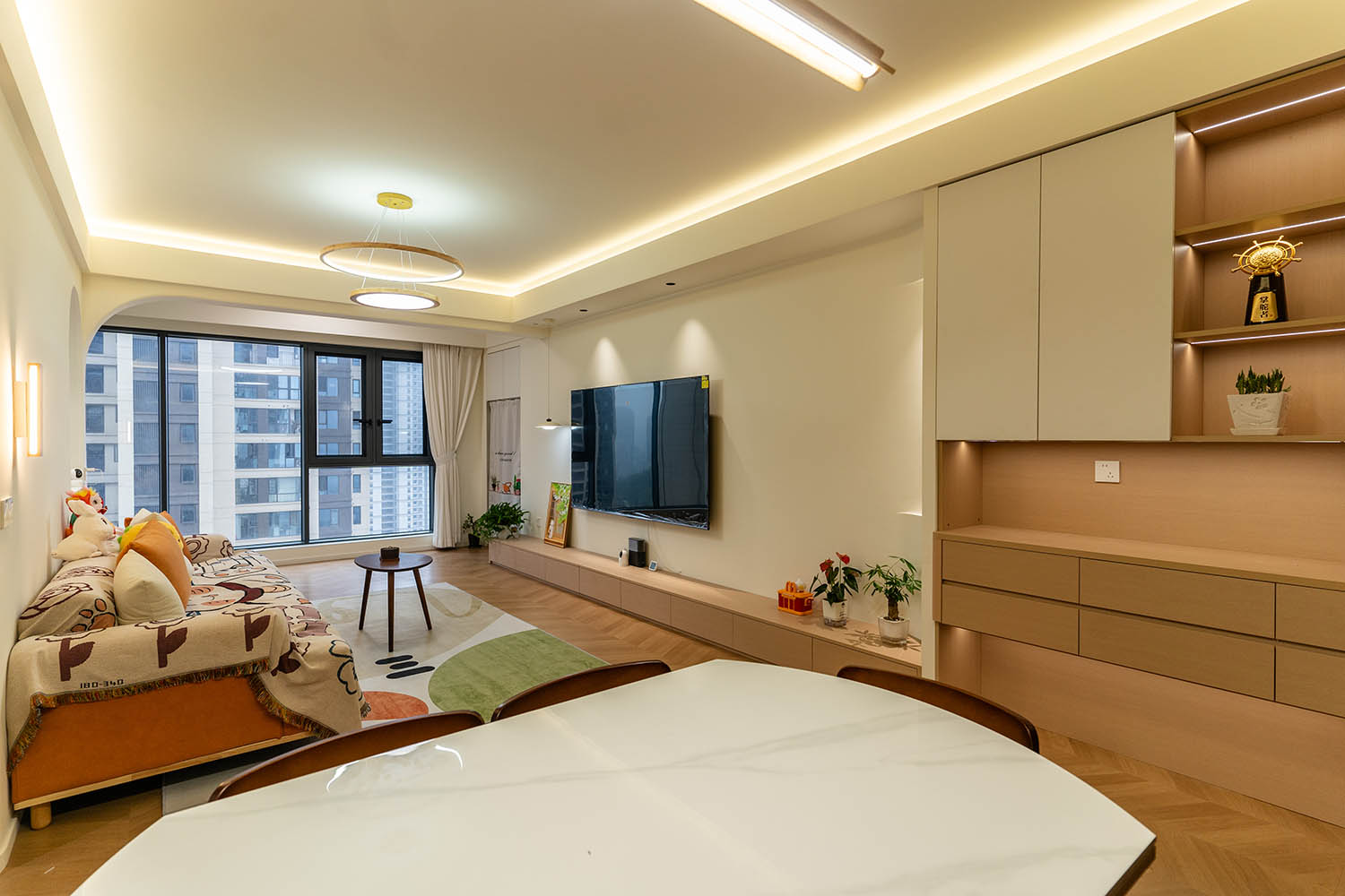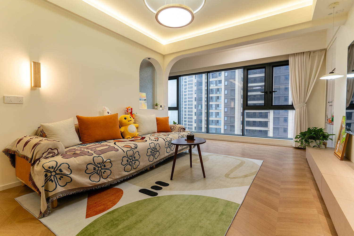 設(shè)計理念與空間基調(diào) 原木奶油風以低飽和度色彩、自然材質(zhì)與柔和線條為核心,在建發(fā)央著100㎡的戶型中,設(shè)計師通過奶油色基底與原木元素的融合,營造出溫暖治愈的居家氛圍。整體風格遵循“簡而不空”的原則,硬裝以簡約的幾何造型與流暢的動線為主,軟裝則強調(diào)材質(zhì)的天然感與舒適性,在實用性與美學之間找到完美平衡。 建發(fā)央著100㎡的原木奶油風,通過色彩、材質(zhì)與光影的巧妙平衡,將自然治愈感融入日常。既以開放式布局與智能收納滿足了現(xiàn)代生活的高效需求,又以弧形曲線與柔軟織物撫慰居者身心,真正詮釋了 “簡約中見細節(jié),溫柔中藏高級” 的居住理想。
