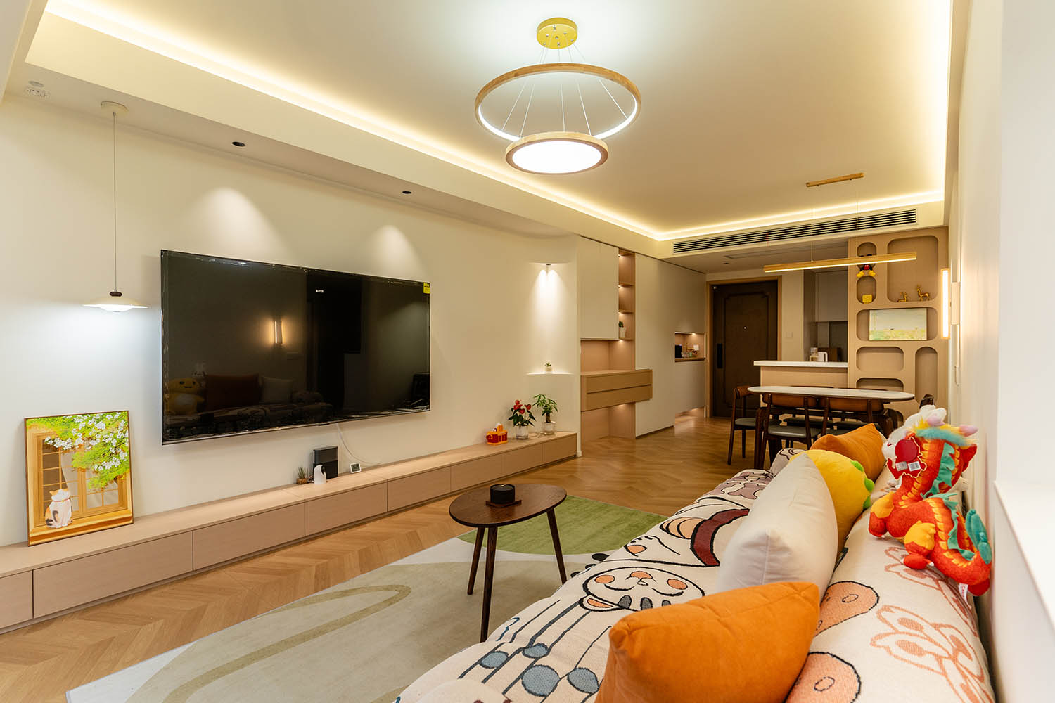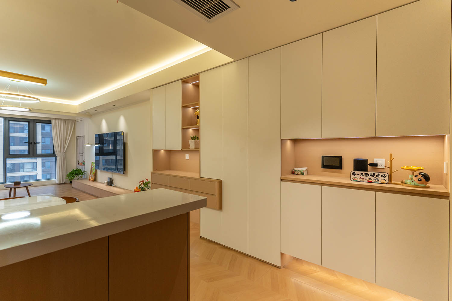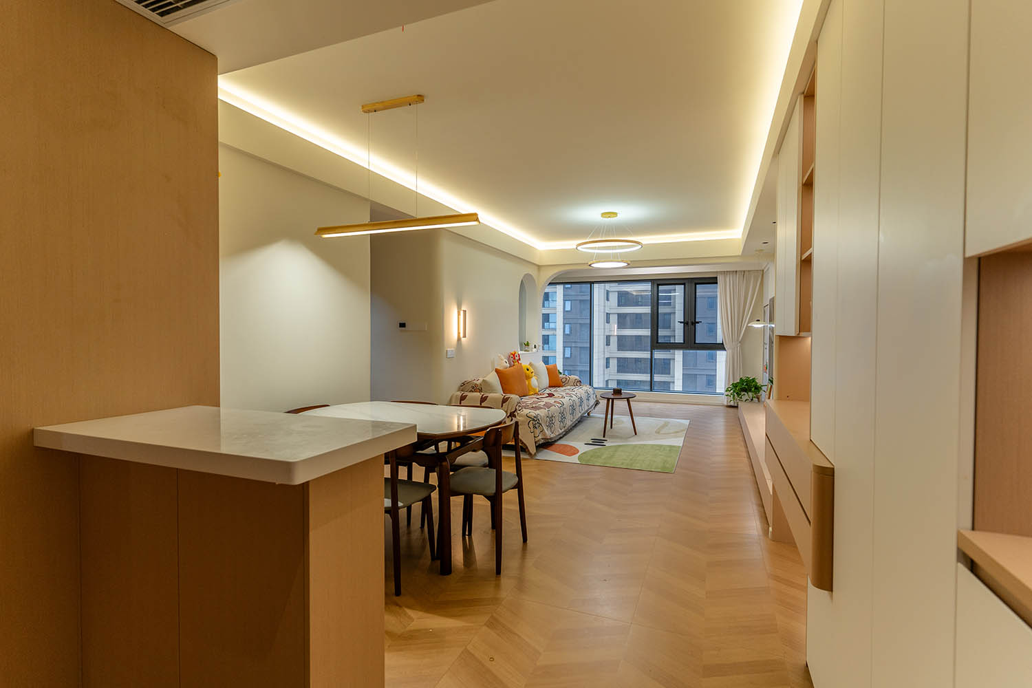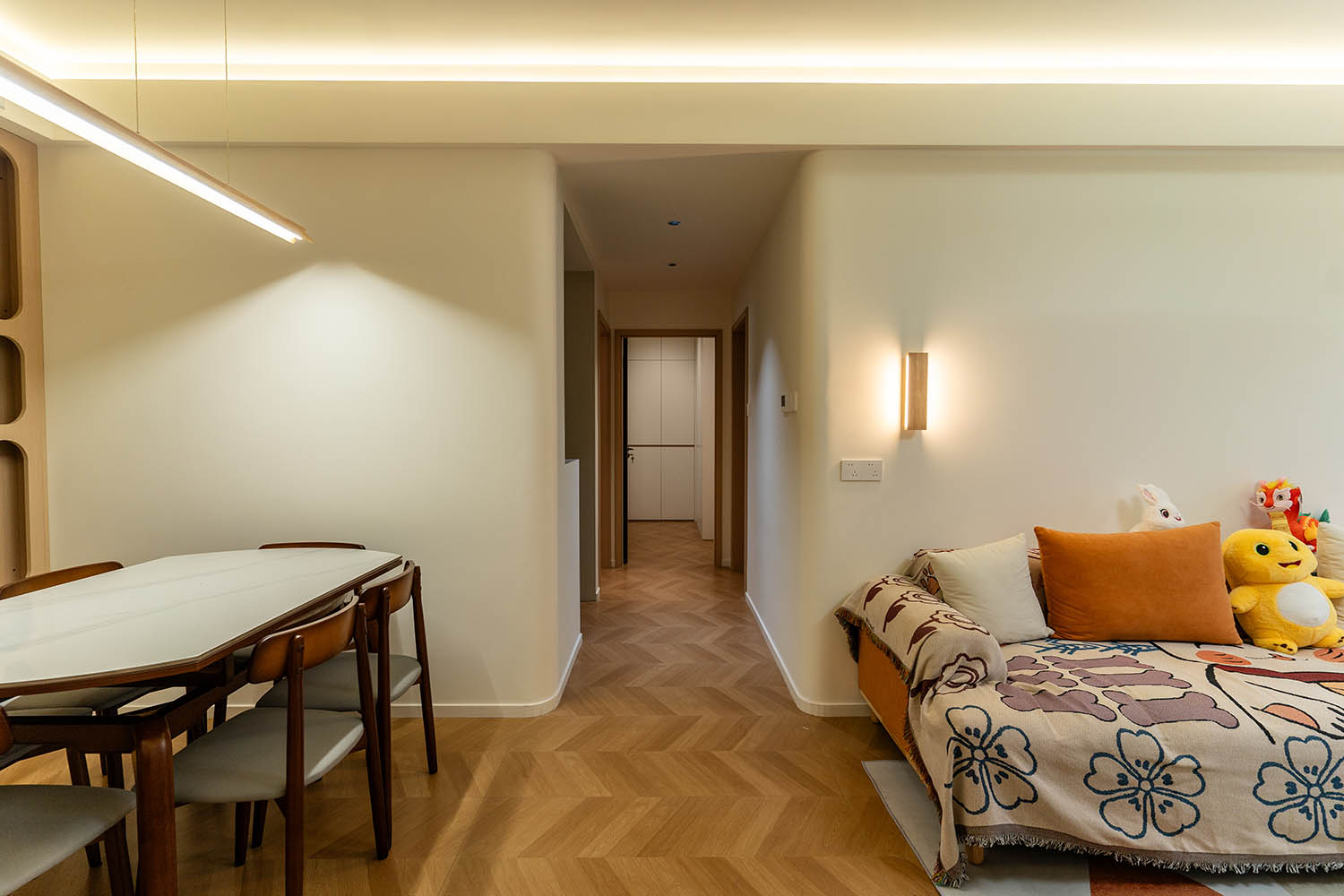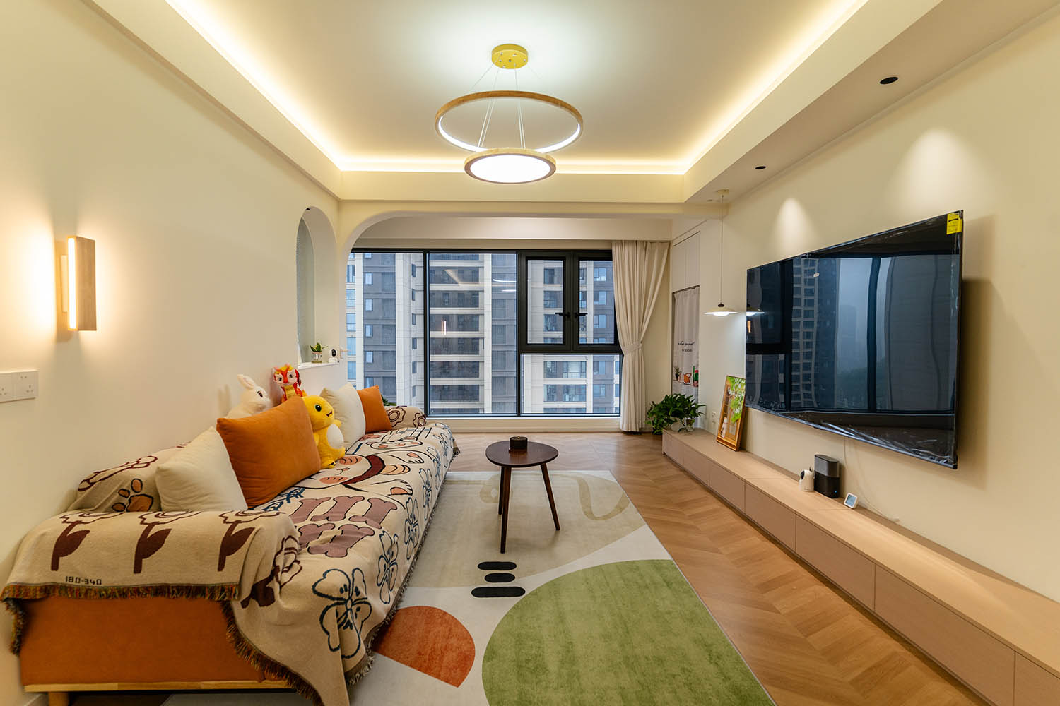 設(shè)計理念與空間基調(diào) 原木奶油風以低飽和度色彩、自然材質(zhì)與柔和線條為核心,在建發(fā)央著100㎡的戶型中,設(shè)計師通過奶油色基底與原木元素的融合,營造出溫暖治愈的居家氛圍。整體風格遵循“簡而不空”的原則,硬裝以簡約的幾何造型與流暢的動線為主,軟裝則強調(diào)材質(zhì)的天然感與舒適性,在實用性與美學之間找到完美平衡。 建發(fā)央著100㎡的原木奶油風,通過色彩、材質(zhì)與光影的巧妙平衡,將自然治愈感融入日常。既以開放式布局與智能收納滿足了現(xiàn)代生活的高效需求,又以弧形曲線與柔軟織物撫慰居者身心,真正詮釋了 “簡約中見細節(jié),溫柔中藏高級” 的居住理想。