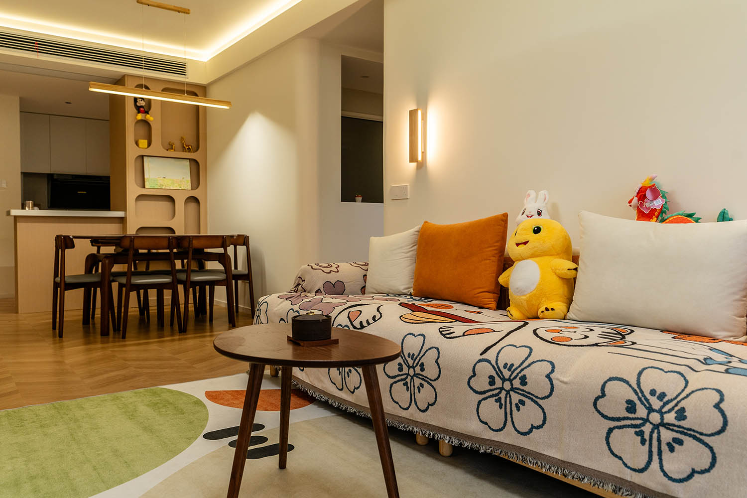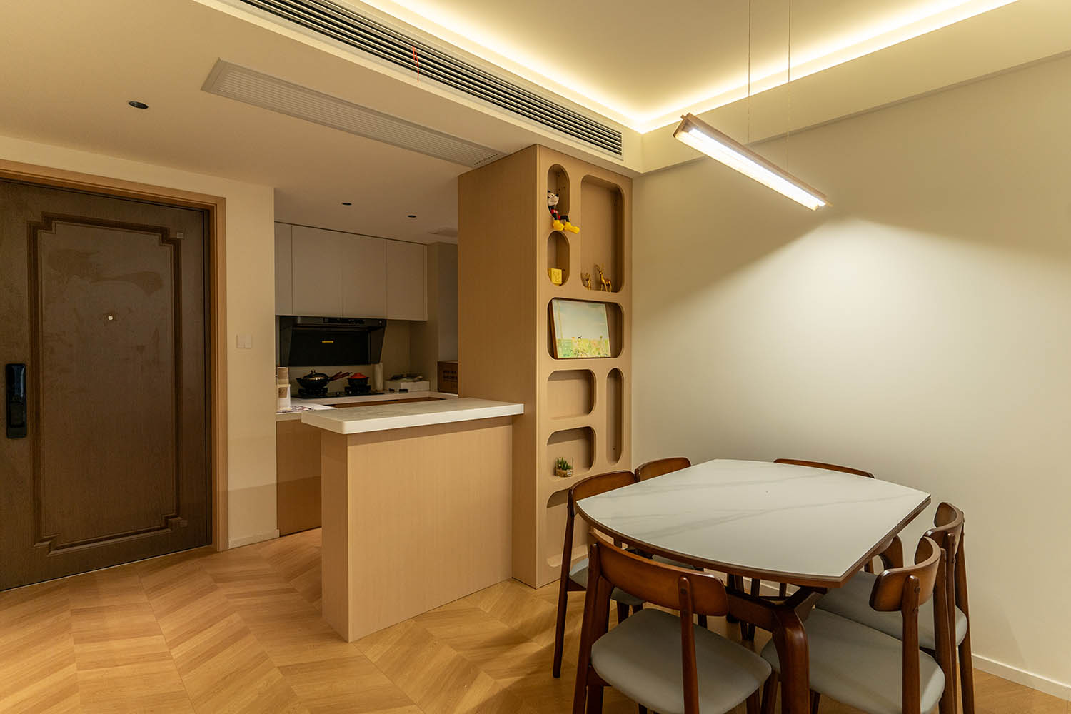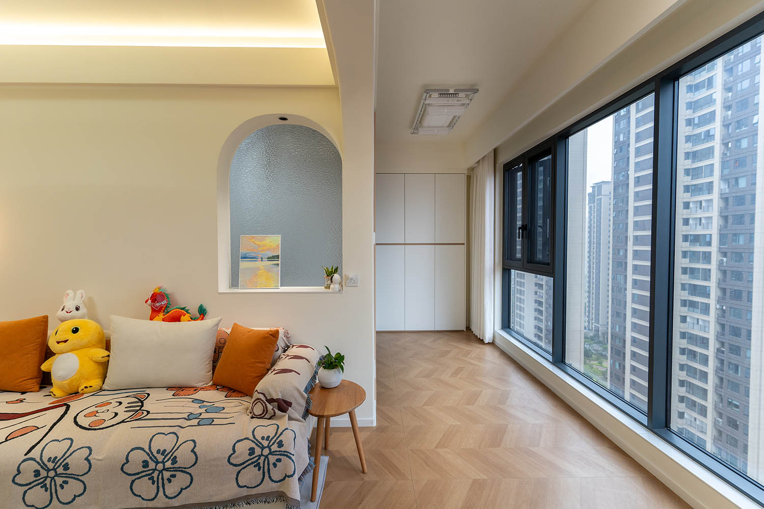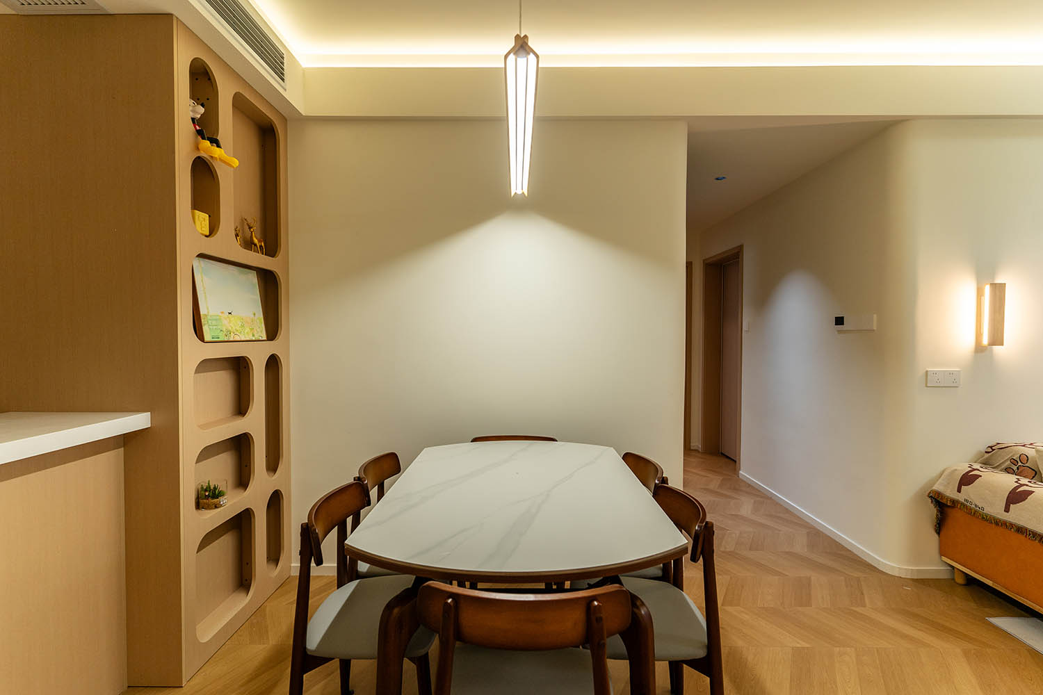 設(shè)計理念與空間基調(diào) 原木奶油風以低飽和度色彩、自然材質(zhì)與柔和線條為核心,在建發(fā)央著100㎡的戶型中,設(shè)計師通過奶油色基底與原木元素的融合,營造出溫暖治愈的居家氛圍。整體風格遵循“簡而不空”的原則,硬裝以簡約的幾何造型與流暢的動線為主,軟裝則強調(diào)材質(zhì)的天然感與舒適性,在實用性與美學之間找到完美平衡。 建發(fā)央著100㎡的原木奶油風,通過色彩、材質(zhì)與光影的巧妙平衡,將自然治愈感融入日常。既以開放式布局與智能收納滿足了現(xiàn)代生活的高效需求,又以弧形曲線與柔軟織物撫慰居者身心,真正詮釋了 “簡約中見細節(jié),溫柔中藏高級” 的居住理想。