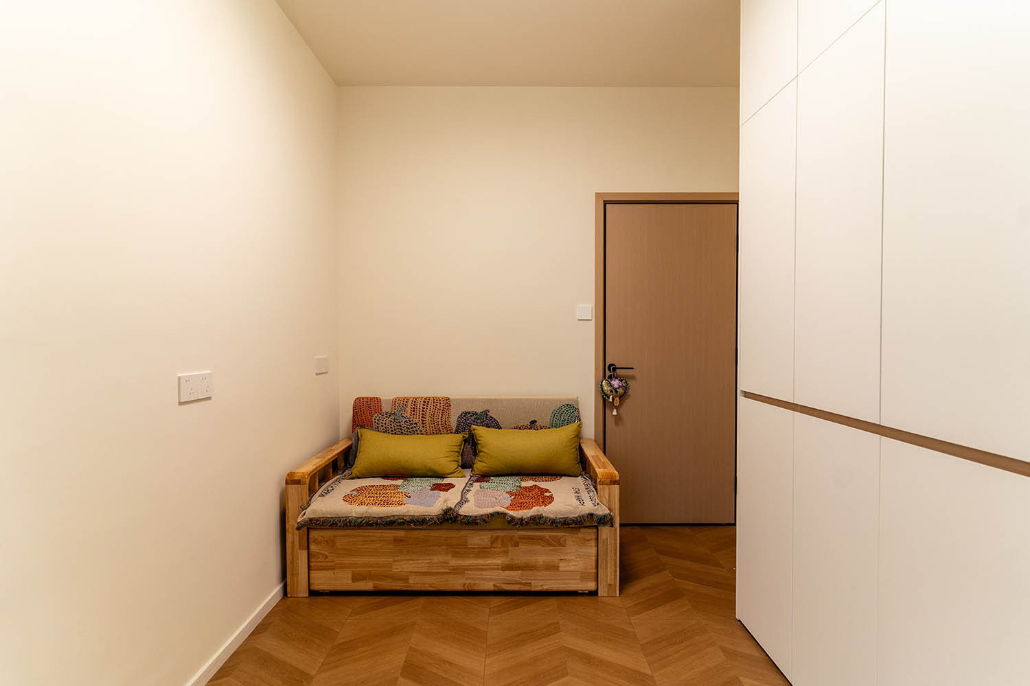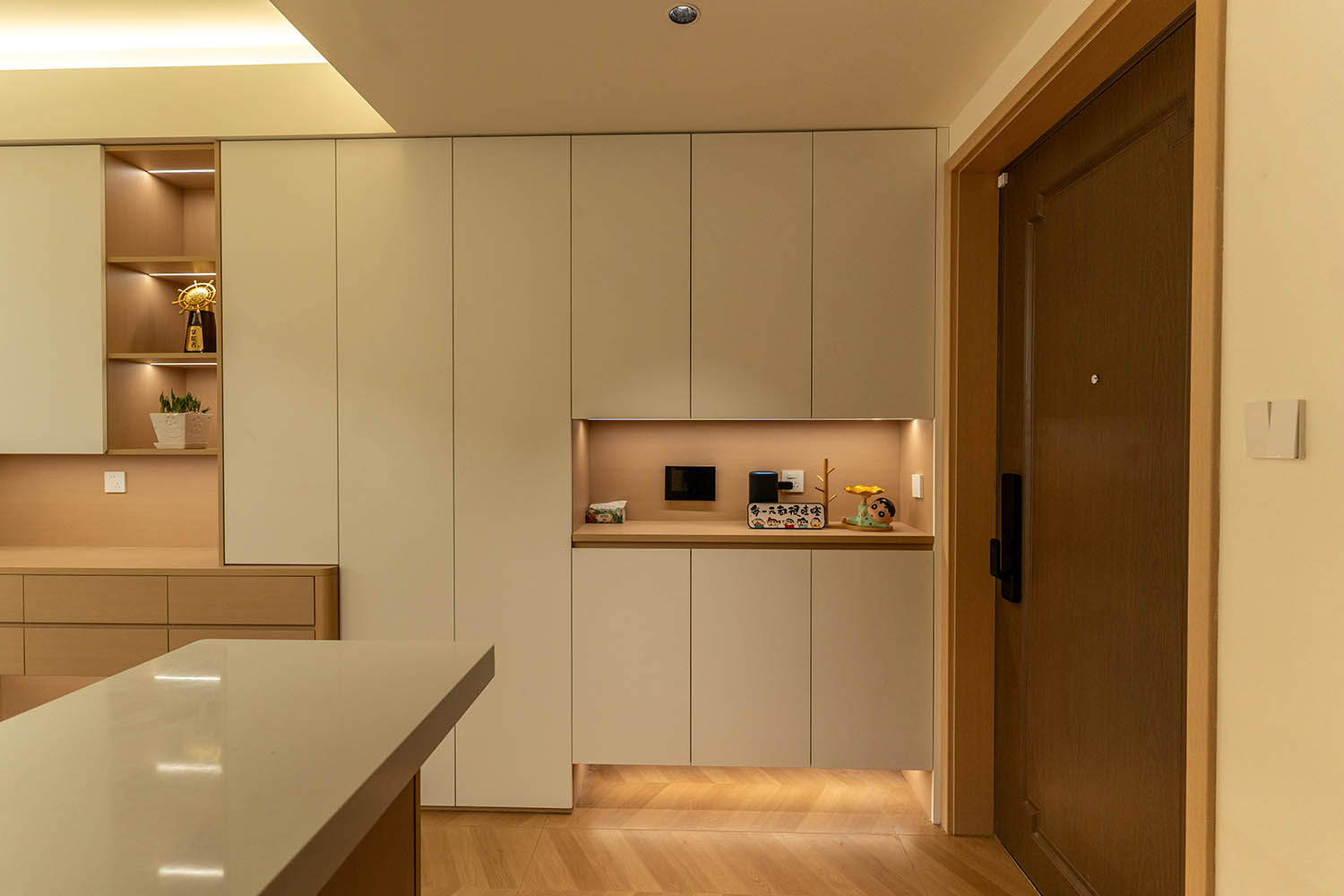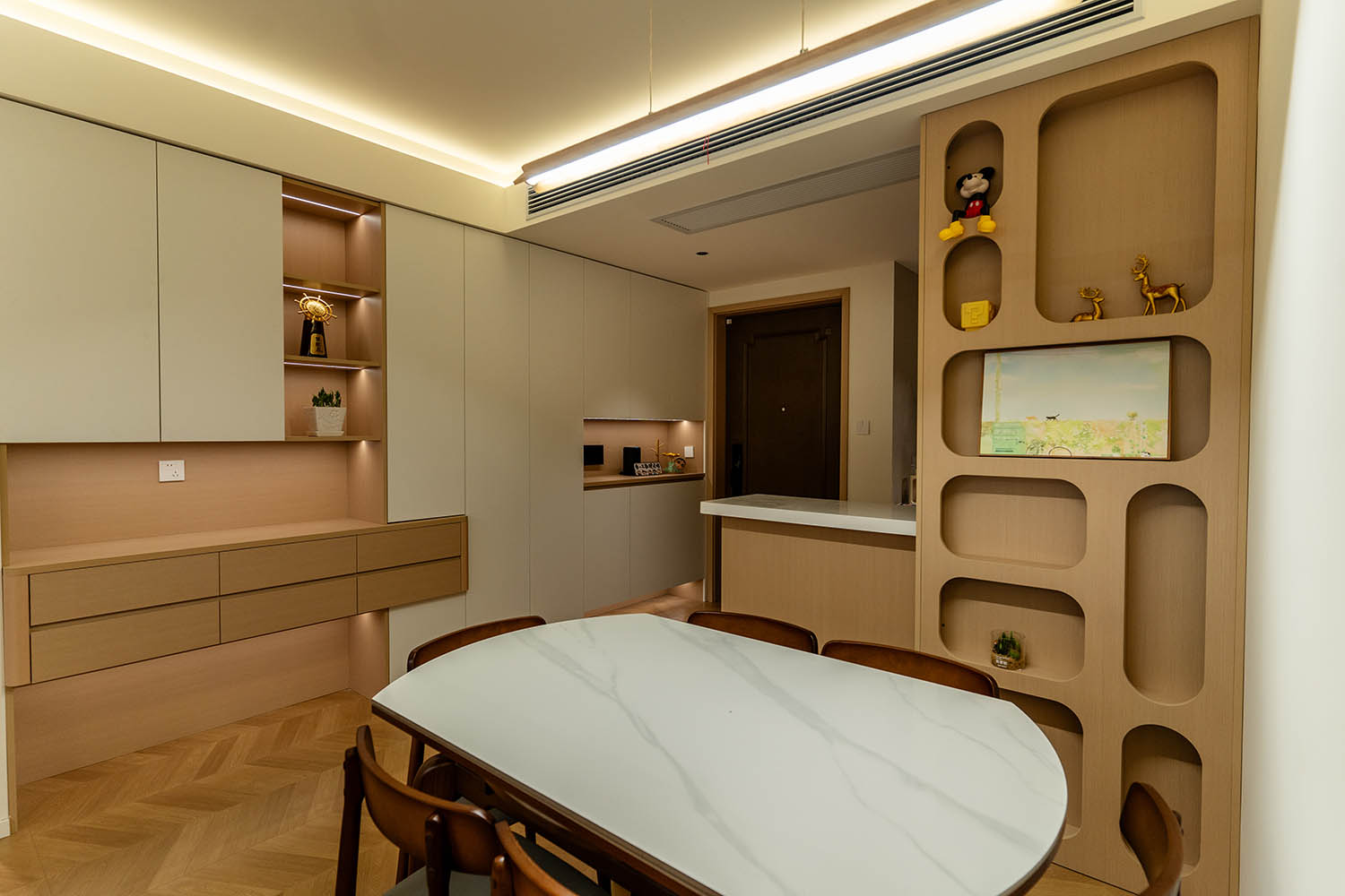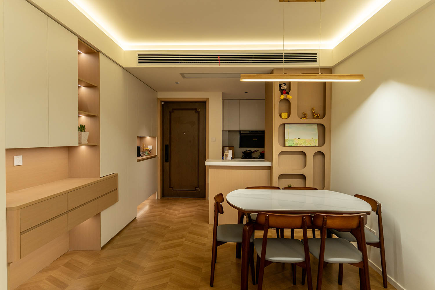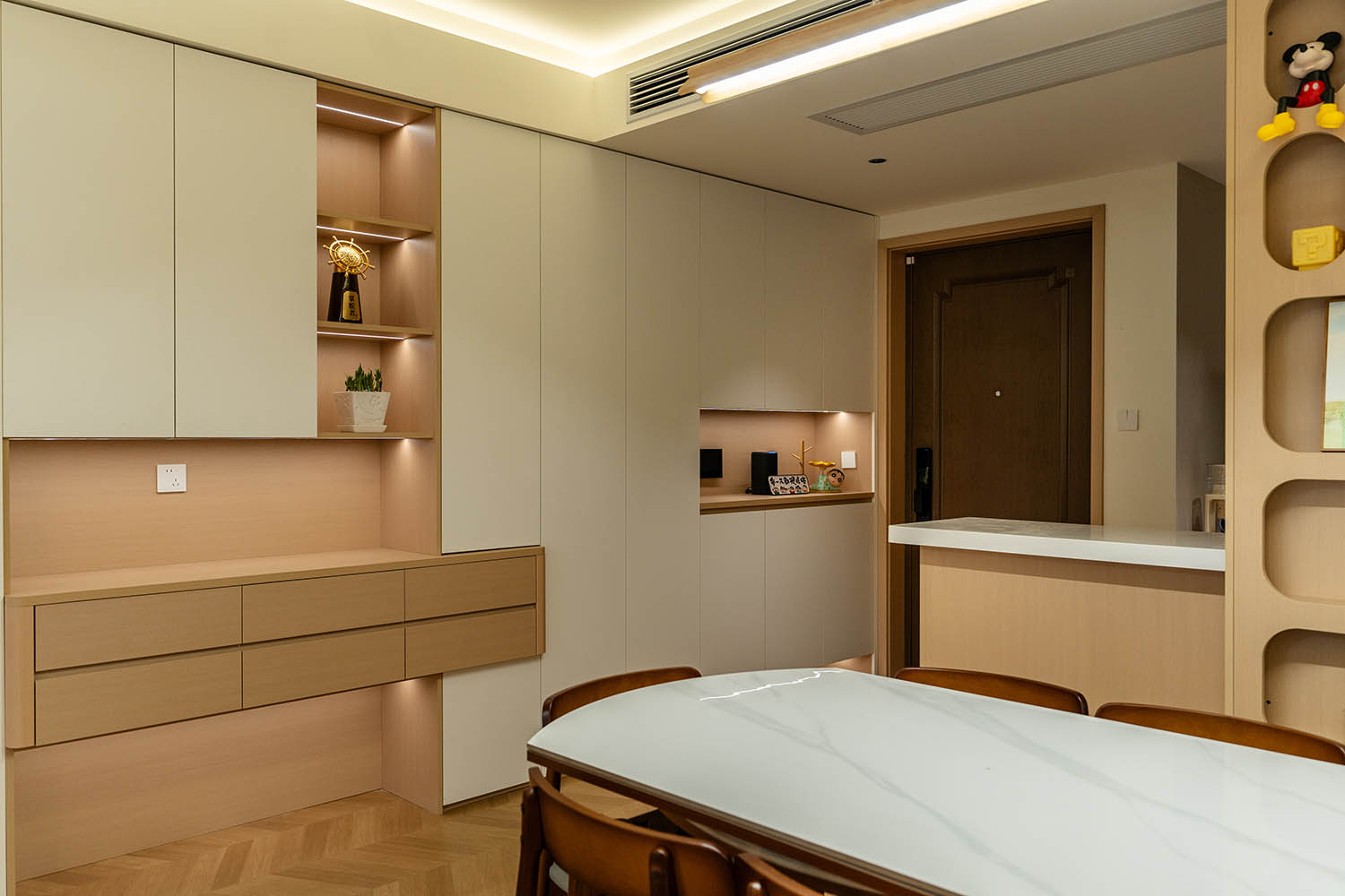 設(shè)計理念與空間基調(diào) 原木奶油風以低飽和度色彩、自然材質(zhì)與柔和線條為核心,在建發(fā)央著100㎡的戶型中,設(shè)計師通過奶油色基底與原木元素的融合,營造出溫暖治愈的居家氛圍。整體風格遵循“簡而不空”的原則,硬裝以簡約的幾何造型與流暢的動線為主,軟裝則強調(diào)材質(zhì)的天然感與舒適性,在實用性與美學之間找到完美平衡。 建發(fā)央著100㎡的原木奶油風,通過色彩、材質(zhì)與光影的巧妙平衡,將自然治愈感融入日常。既以開放式布局與智能收納滿足了現(xiàn)代生活的高效需求,又以弧形曲線與柔軟織物撫慰居者身心,真正詮釋了 “簡約中見細節(jié),溫柔中藏高級” 的居住理想。
