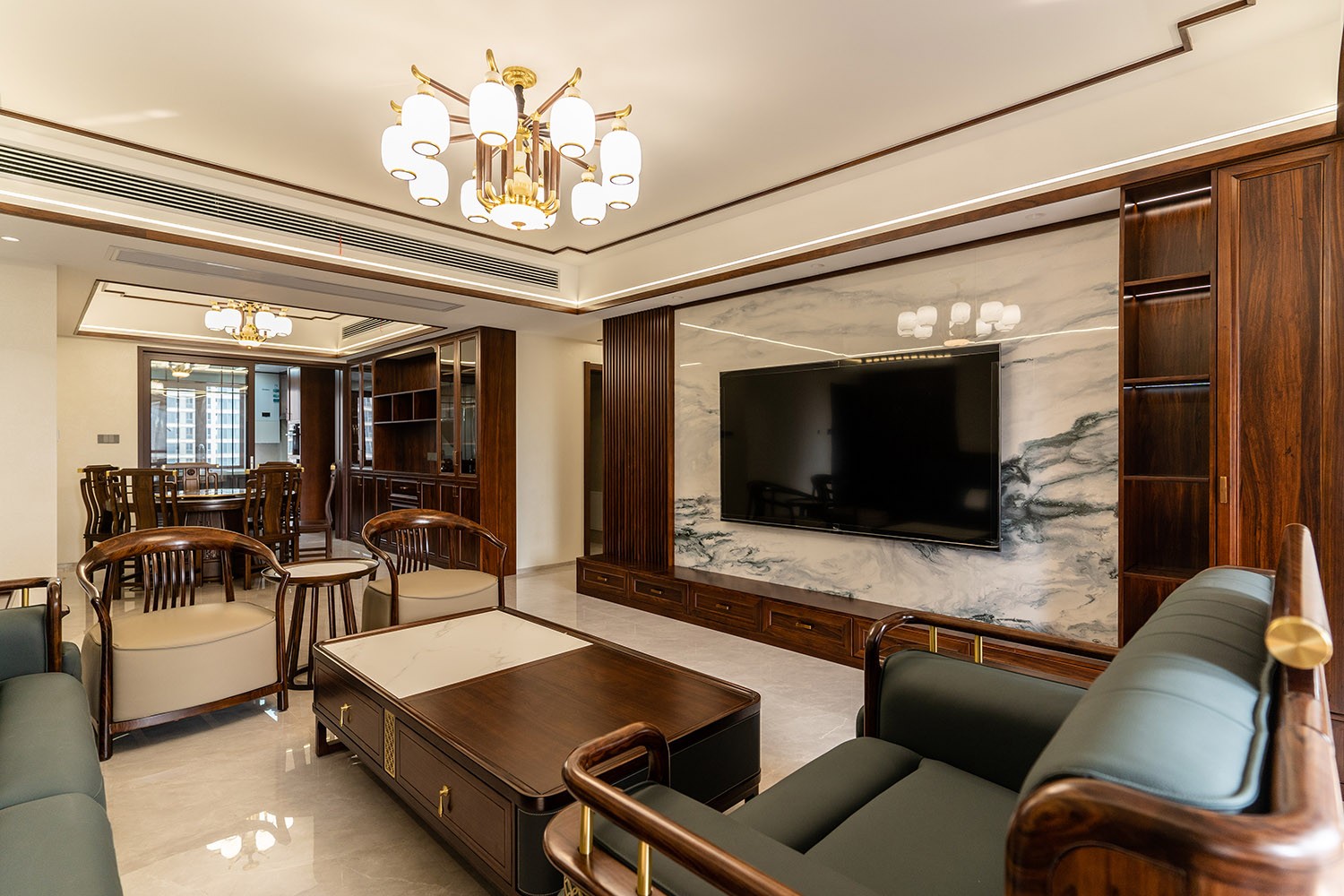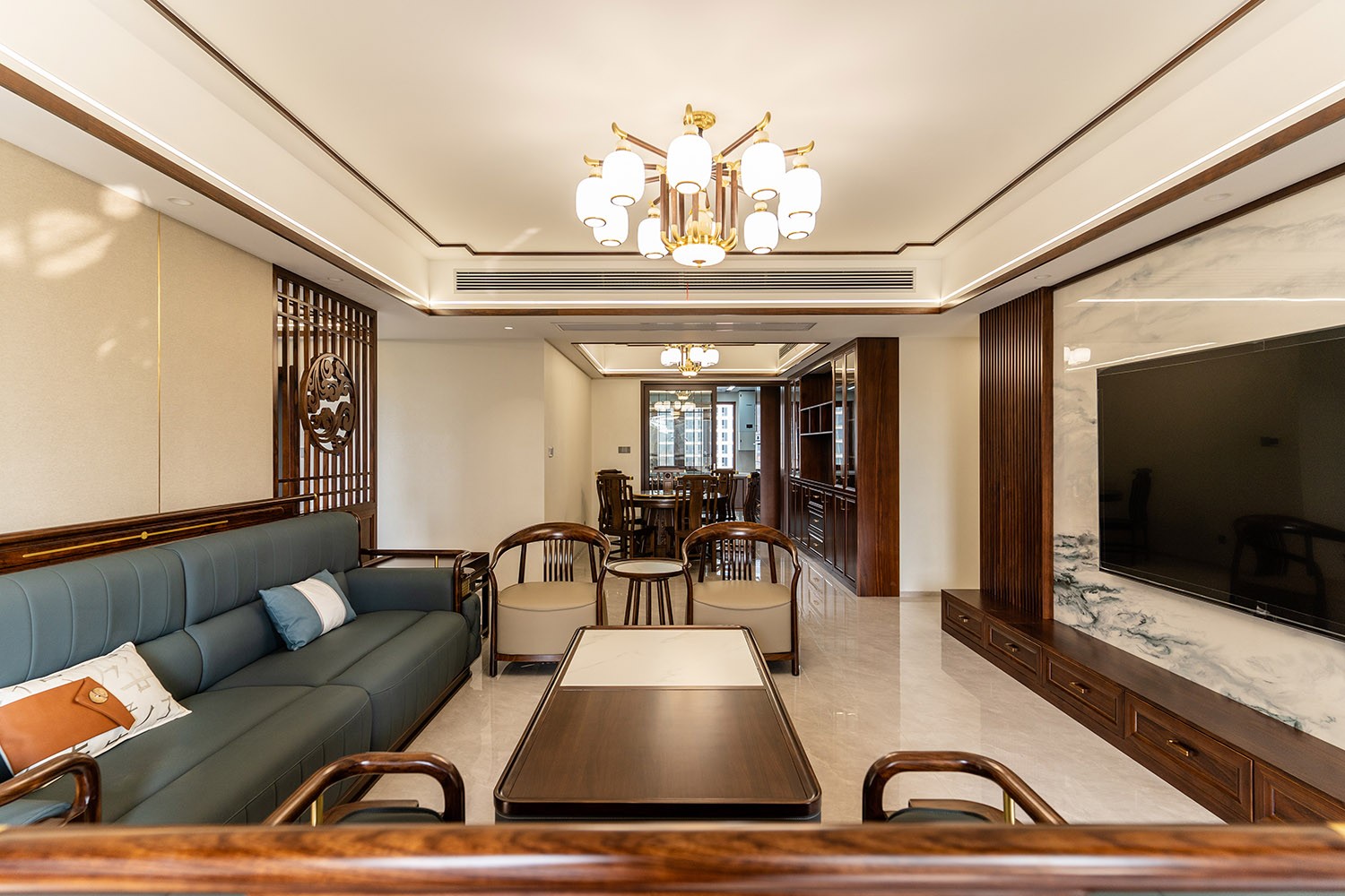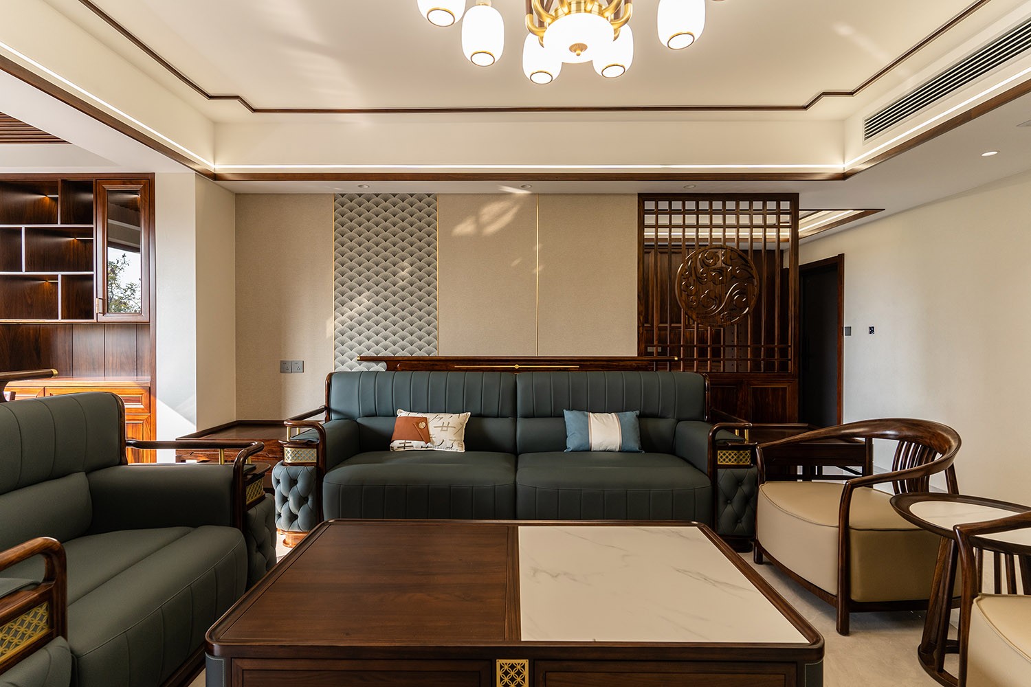 新中式風(fēng)格,是東方美學(xué)精神在現(xiàn)代語境下的華麗轉(zhuǎn)身與集大成者。在220平米的寬闊天地里,它得以超越符號(hào)化的堆砌,轉(zhuǎn)而通過宏大的空間敘事、深層的材質(zhì)對(duì)話與詩意的意境營造,打造一座兼具文化傳承、家族風(fēng)范與當(dāng)代舒適的傳世大宅。 本案的核心設(shè)計(jì)理念是 “大象無形,大音希聲” 。旨在以恢弘的空間尺度,承載最含蓄內(nèi)斂的東方意境。設(shè)計(jì)追求的不是形式的繁復(fù),而是空間氣場、文脈氣韻與生活氣息的完美融合。通過中軸對(duì)稱、虛實(shí)相生、框景借景等傳統(tǒng)造園手法,在現(xiàn)代大宅的框架內(nèi),營造出一種可供三代同堂觀想、品鑒與傳承的居住體驗(yàn)。