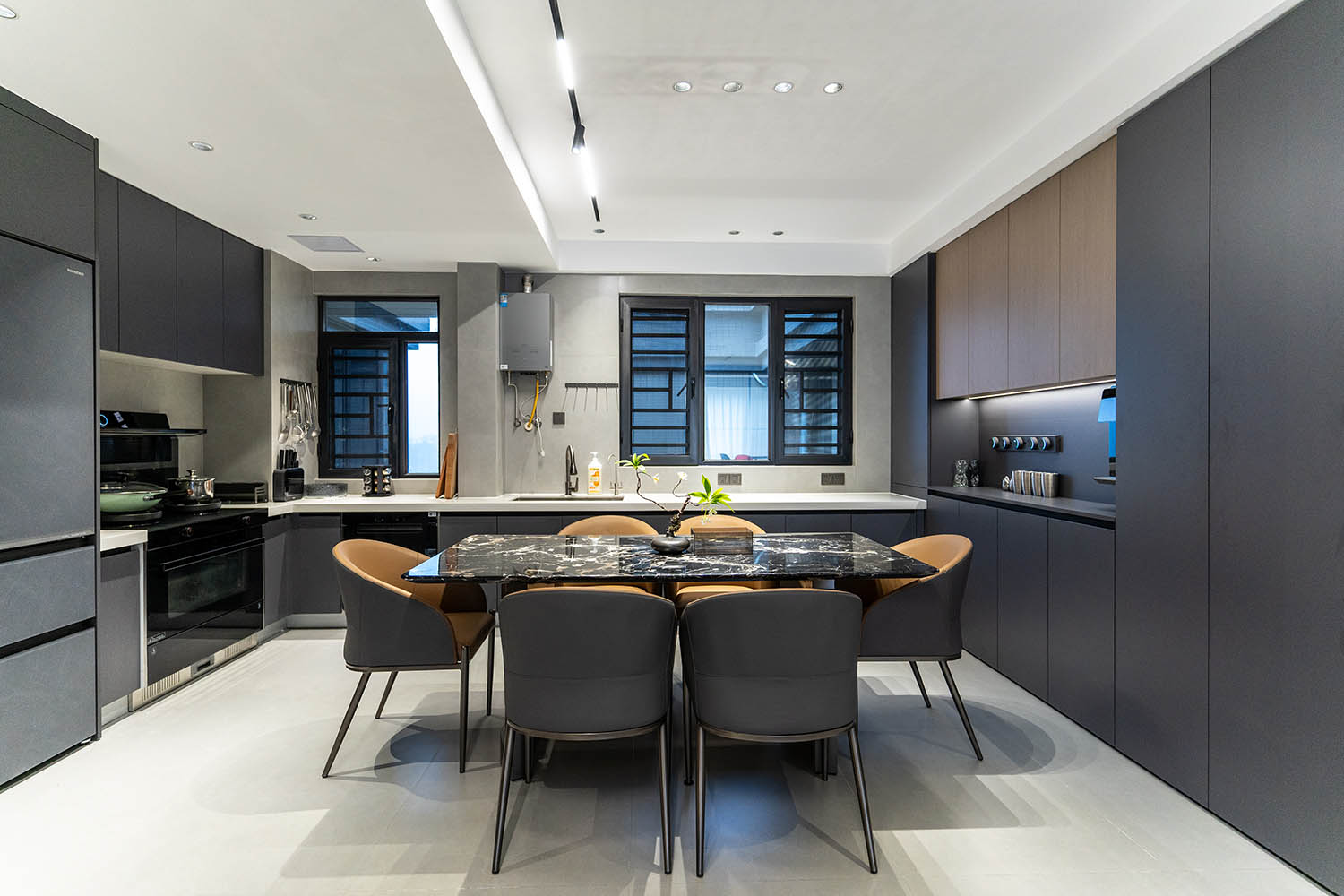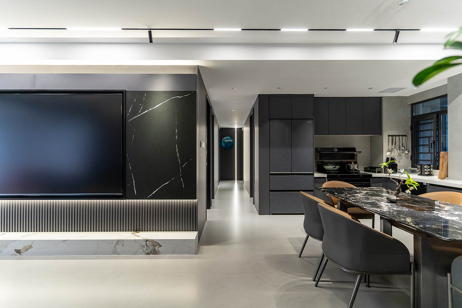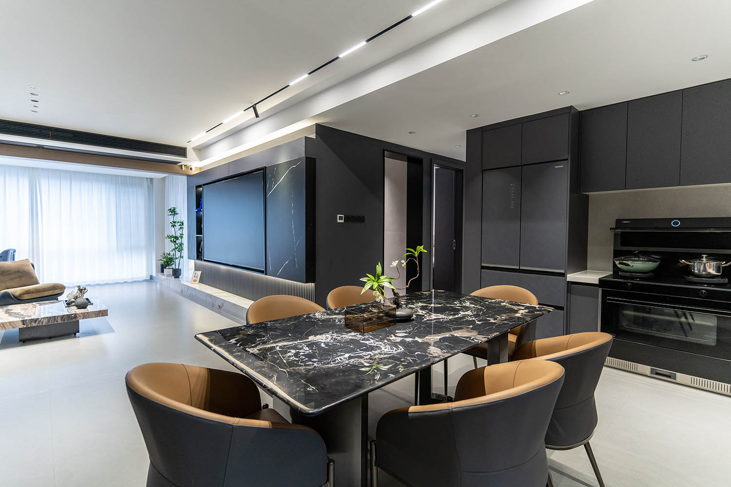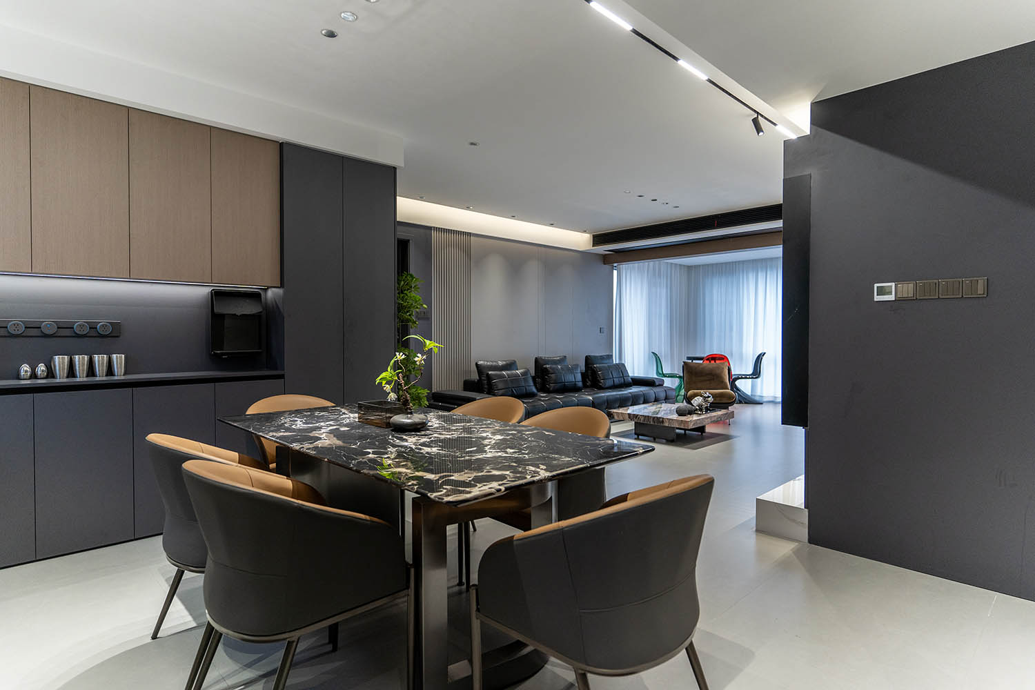 全屋以灰咖色為基調(diào),整個空間簡約大氣,有層次感,打造了一個高級沉穩(wěn)的家居空間,區(qū)塊之間規(guī)律的穿插與互動構(gòu)成統(tǒng)一的環(huán)境語言,形成具有秩序感和儀式感的居住體驗。