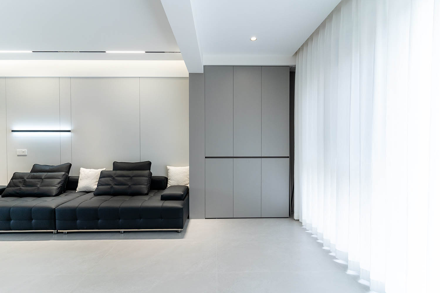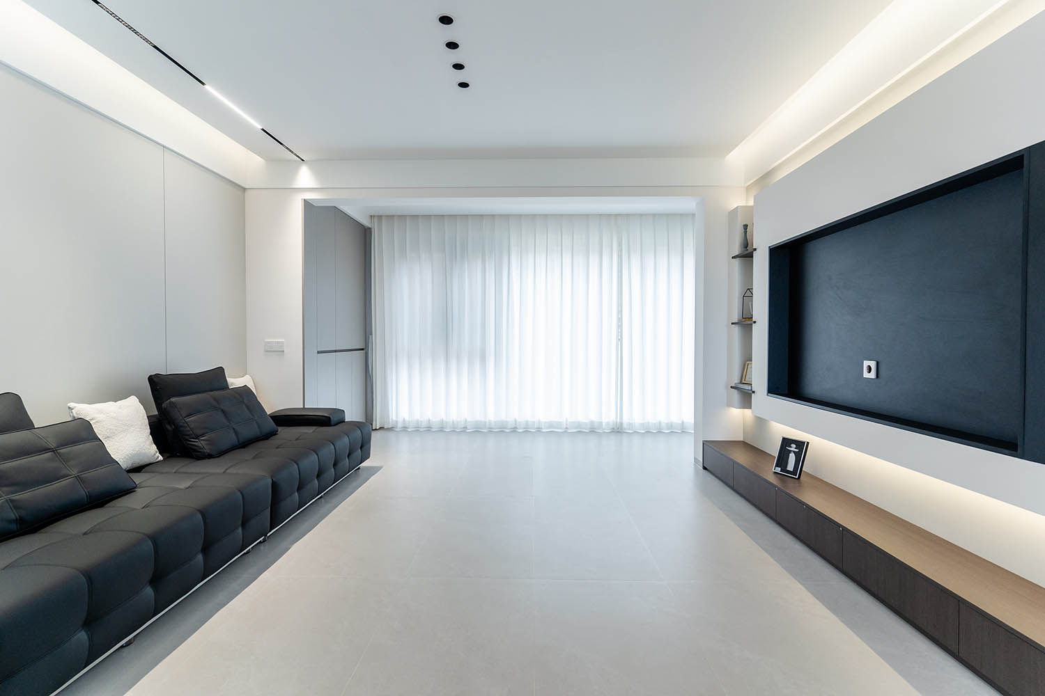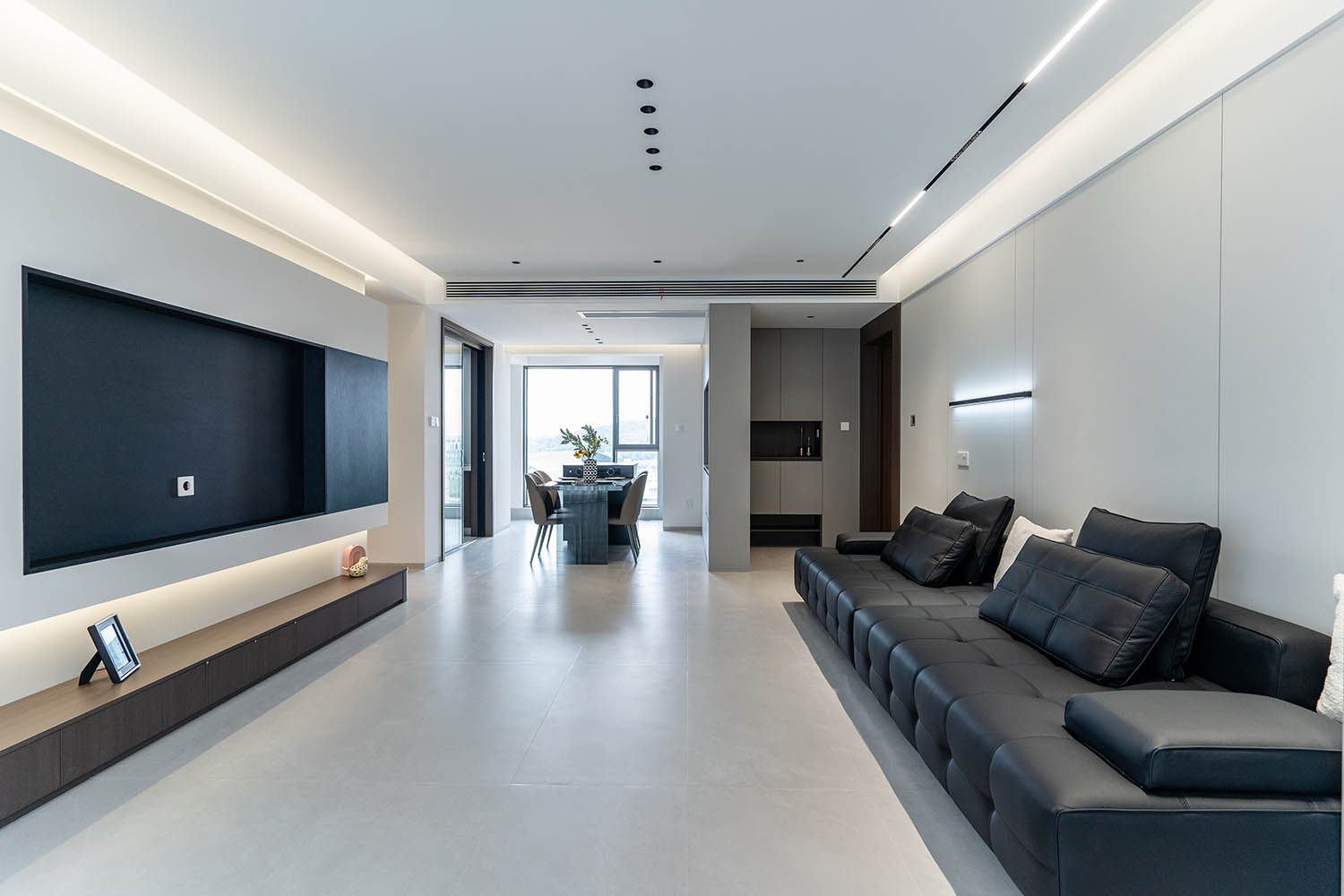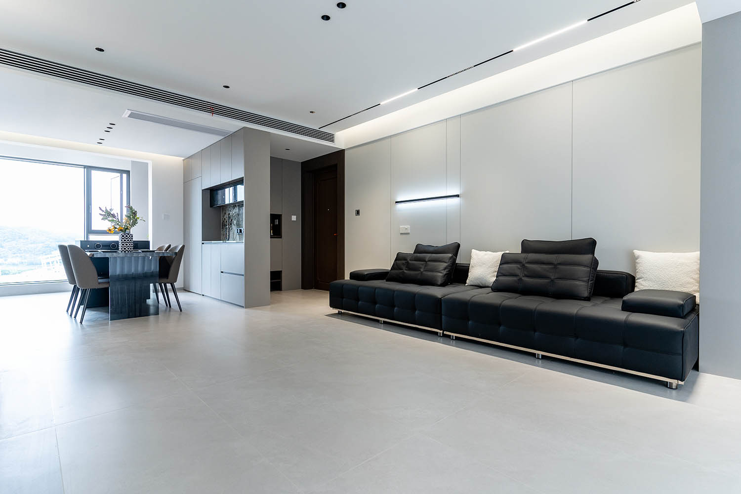 用黑、白、灰的經典碰撞,詮釋意式極簡的「做減法的藝術」。沒有冗余裝飾,以利落線條、純粹色調,讓空間回歸「實用與質感共生」的本質,每一處都藏著 “用必要定義高級” 的設計智慧。 無主燈設計 + 線性燈帶,讓光線柔和包裹空間;黑色皮質沙發(fā)簡化形態(tài),與灰色背景墻呼應,詮釋意式「隱于簡的高級感」,舍去繁雜裝飾,還原空間本真互動場域。每一寸存在都值得被凝視,讓走過空間的人,忍不住贊嘆這份 “不動聲色的精致” 。