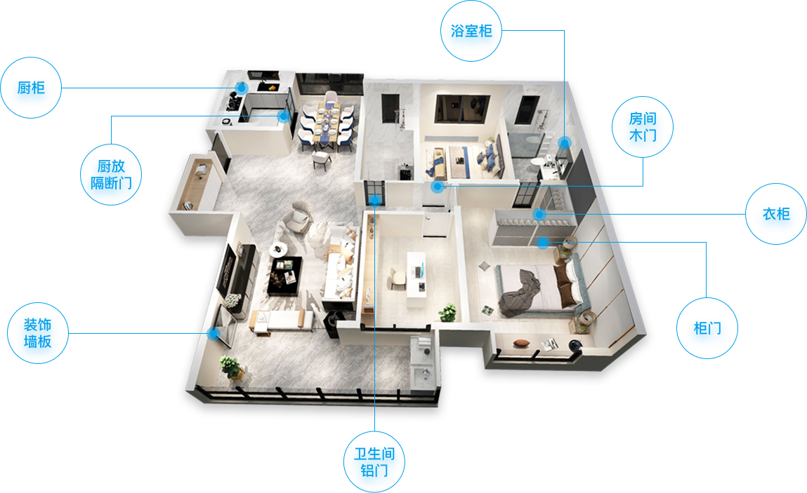 同色配套是指:新房裝修所需的衣柜,柜門,櫥柜,房間木門,衛(wèi)生間鋁門廚房隔斷門及浴室柜和裝飾墻板這八類核心產(chǎn)品在款式,比例,風(fēng)格,質(zhì)感色彩等方面高度協(xié)同,整體融合,體現(xiàn)出格調(diào)一致的超強(qiáng)設(shè)計(jì)感!讓家裝提高兩個(gè)檔次!