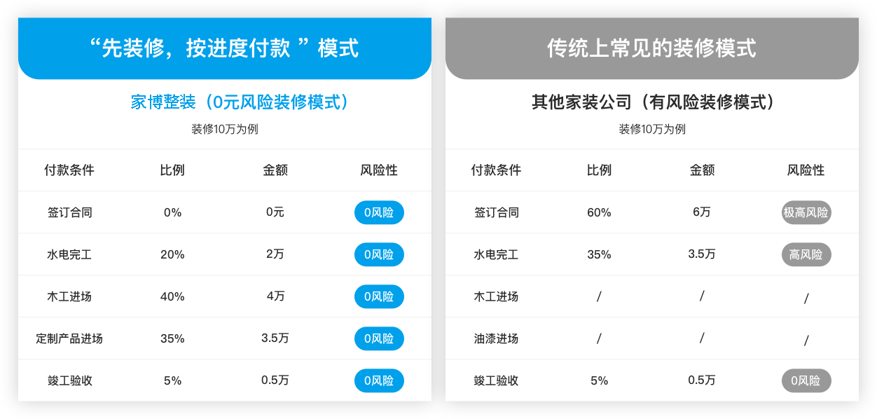 簽了合同,裝修公司給到業(yè)主的只是一紙合同、一個(gè)承諾!只有“先裝修,按進(jìn)度付款”的模式,讓裝修公司先干活,業(yè)主后交錢,才是真正的0風(fēng)險(xiǎn)裝修!