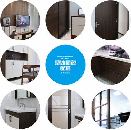 同色配套是指:新房裝修所需的衣柜,柜門(mén),櫥柜,房間木門(mén),衛(wèi)生間鋁門(mén)廚房隔斷門(mén)及浴室柜和裝飾墻板這八類(lèi)核心產(chǎn)品在款式,比例,風(fēng)格,質(zhì)感色彩等方面高度協(xié)同,整體融合,體現(xiàn)出格調(diào)一致的超強(qiáng)設(shè)計(jì)感!讓家裝提高兩個(gè)檔次!